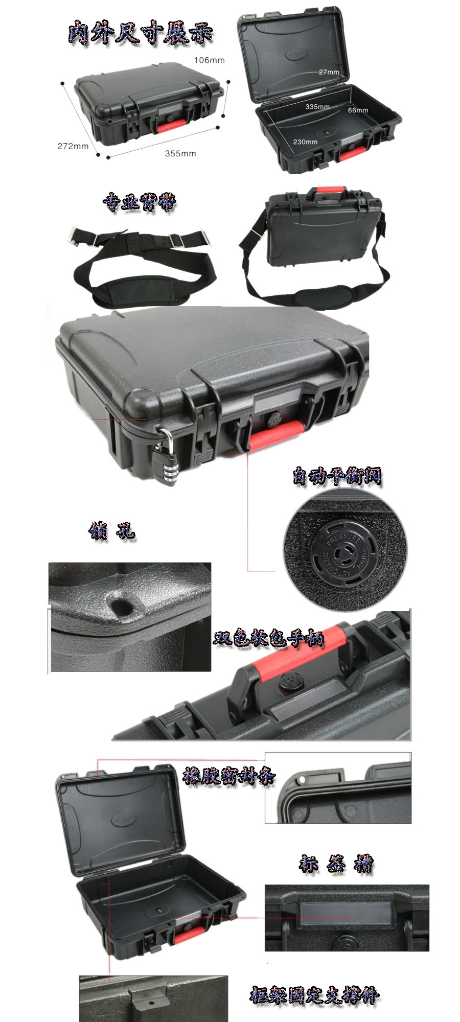 簡(jiǎn)要說(shuō)明:廣泛用于傳媒、公安、消防、軍隊(duì)、航空、戶外攝影、野外考察、科學(xué)探測(cè)等眾多領(lǐng)域的高端儀器、儀表。具有高強(qiáng)度、高抗壓沖擊、防潮、絕對(duì)密封、防塵、防水等特點(diǎn)。產(chǎn)品材質(zhì):ABS原料,箱體采用高抗沖擊的高分子聚合材料一體注塑成型,密封采用扁型彈性發(fā)泡密封橡膠條,確保防水氣密,所有較軸均采用不銹鋼材質(zhì)。