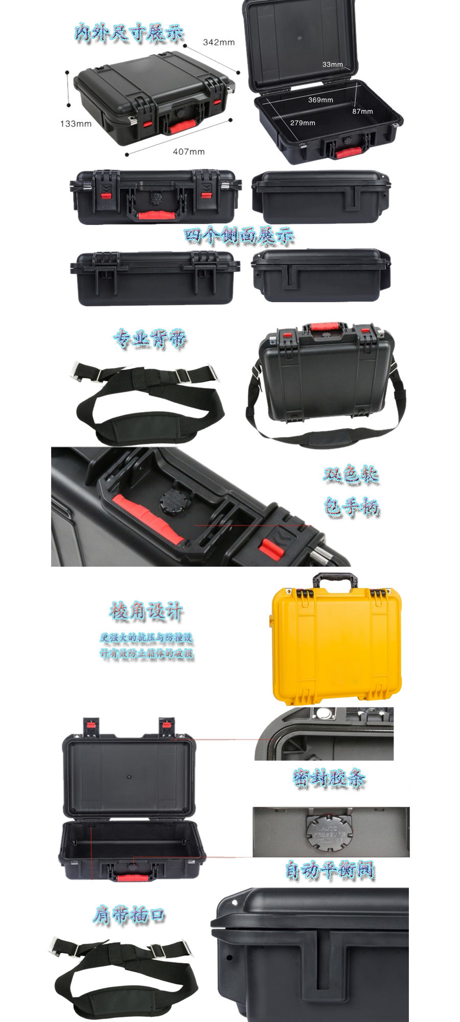 簡要說明:廣泛用于傳媒、公安、消防、軍隊(duì)、航空、戶外攝影、野外考察、科學(xué)探測等眾多領(lǐng)域的高端儀器、儀表。具有高強(qiáng)度、高抗壓沖擊、防潮、絕對密封、防塵、防水等特點(diǎn)。產(chǎn)品材質(zhì):ABS原料,箱體采用高抗沖擊的高分子聚合材料一體注塑成型,密封采用扁型彈性發(fā)泡密封橡膠條,確保防水氣密,所有較軸均采用不銹鋼材質(zhì)。